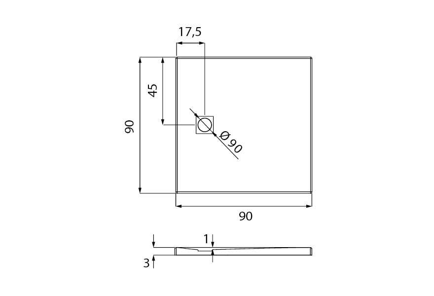 Глибина піддону 1 см, отвір під сифон ø90